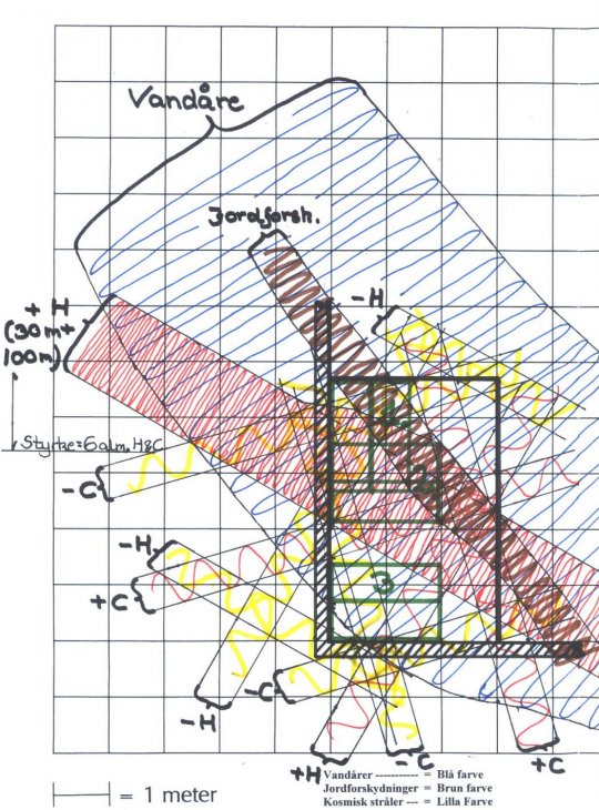 Tegningen til venstre. Dreng 4 år konstateret 3 tumor i nyrerne. Sovet her i 2 år. Den grønne markering er sengepladsen. Energi felterne er røde. Den brede +H (30m) tæller som 3 almindelige jordstråler og de 2 plus C rammer også i den øverste halvdel af sengen. Så det er en styrke som 5 jordstråler i alt. Vandåren koster generelt for meget på immunsystemet, hvorved jordstrålerne H og C får større indflydelse. Revnen i undergrunden (Jordforskydningen) er med til at øge strålings styrken også. Feltet i sengen betegner jeg som et meget kraftigt energi felt. Den stiplede grønne sengeplads er den jeg anbefaler, at der straks flyttes til. Klik på tegningen for at få den op i stor størrelse.